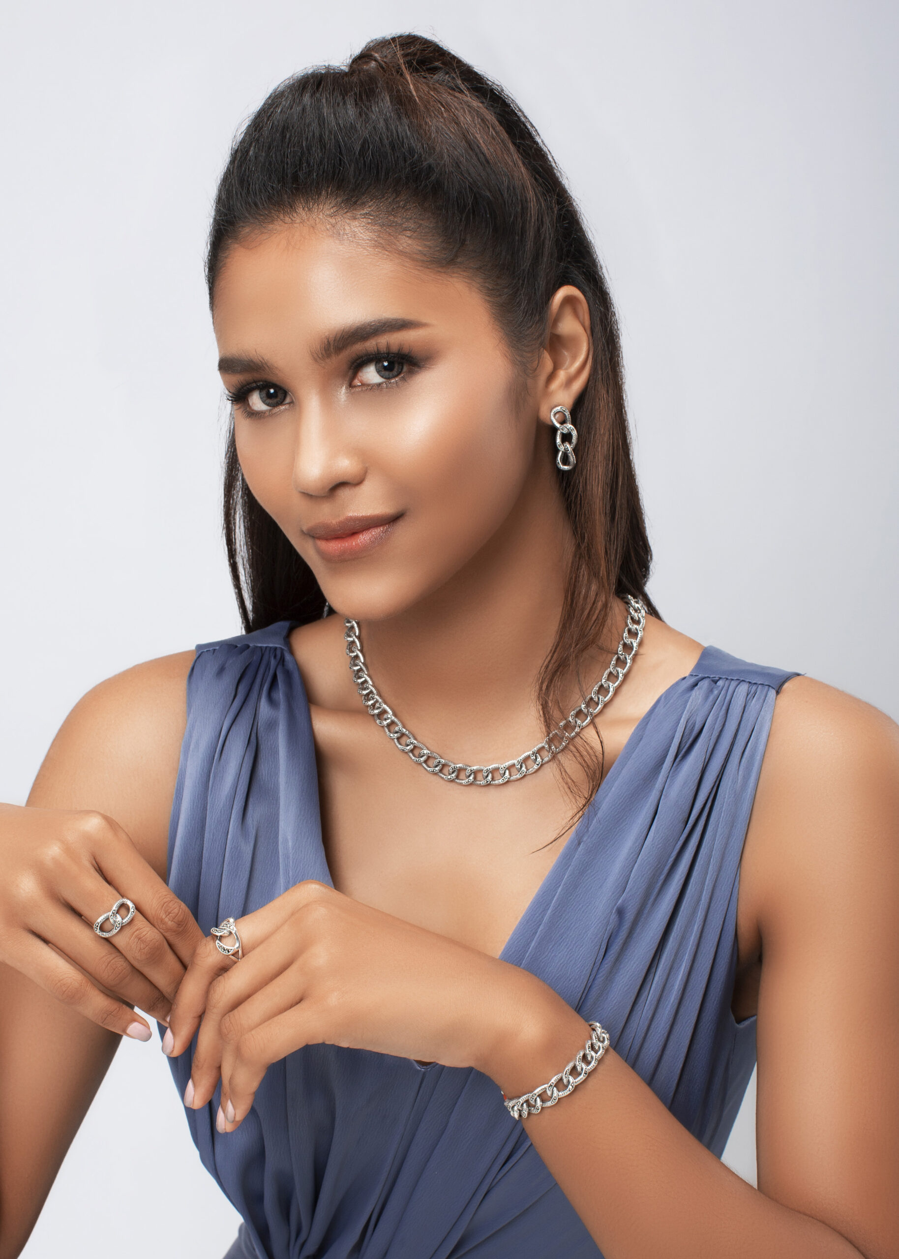 The fusion of silver’s cool brilliance, the earthy richness of brown skin, and the subtle sparkle of marcasite stones creates a look that is both vintage and modern, delicate yet powerful. This unique pairing reveals how texture, tone, and light can come together to enhance natural beauty in the most elegant way. 925